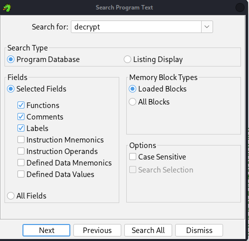 If you find a binary routine that looks like decryption, load it into a disassembler/RE tool and search for likely function names (e.g., decrypt, dm_decryptFile, or other vendor-named helpers). The goal is to: